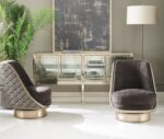 Expressing your unique perspective is easy with this sublime swivel chair. Bold in its every detail, it features a barrel base finished in Harvest Bronze with a Champagne Gold metal wrap. Two luxe fabrics are combined to masterful effect while a painted wood trim creates a pencil rail outlining its shapely silhouette. Its interior is upholstered in a plush espresso chenille while its exterior is impeccably tailored in a textural geometric pattern highlighted with gold metallic yarns. Perfect on its own or paired together for visual impact, this chair represents the essence of Art Deco modernized for today’s lifestyles.
