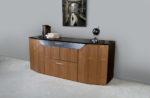 The sleek and functional Haven credenza brings style and storage to your workplace, along with a rich palette of materials. The flattened arch theme of our popular Hyper family is apparent here, from the Sable or Caviar glass top and unique front profile to the dramatic champagne-plated utility drawer— and even the handles! When combined, the Haven bookcase, file cart, desk, and credenza create a truly striking workplace ensemble. The Haven credenza is available in any Elite powder-coat finish, with either Sable or Caviar etched tempered glass. Walnut veneer components are available in a variety of finishes. Companion file cart, bookcase, and buffet also available.