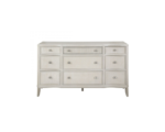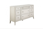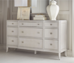 Romantic curves, fluting details and a light and airy Chroma finish with a bit of silver-dust provide a soft backdrop for jewelry-like hardware on the Nine-Drawer Dresser.