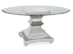 The Moiselle Dining Table combines the shape of a carved pedestal dining base and the sparkle of antique mirror to achieve a very sophisticated look. A 1/2 Clear Glass top in 60 Round with a shaped Eurogee edge will add a touch of glamour to your dining experience. Classification: 3181 Dining Companion: Aramis Parsons Chair Materials: Antique mirror, silver leaf and clear glass Suggested Uses: Dining Room