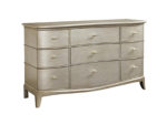 Full-on glamour: the serpentine front nine-drawer Starlite Dresser has jewelry-like gold toned drawer hardware and a silver painted finished that has been brushed with glaze for warmth and gentle aging.