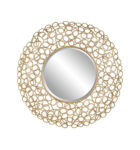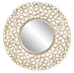 Handcrafted from solid iron, this round features a dramatic 3-dimensional frame made from curled gold leaf details. Mirror features a generous 1 1/4″ bevel.