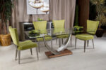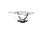The commanding Tangent Square Dining Table will certainly be the center of attention in any room. Shimmering Champagne-plated arms curve gently upwards, grasping solid stainless steel discs that are permanently bonded to the generous glass top. Understated feet lift the massive base from the floor, while providing an extra metallic accent. Base is offered in Rift-cut Oak or Walnut Veneer, while steel feet are available in Topaz only. Clear ½” glass tops are tempered for strength and safety. Steel chair frames are available in any Elite durable powder-coat finish. Designed to complement many of our dining chairs