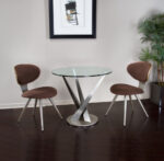 The Vera dining chair will have all your friends talking. Graceful and unique reflections of the past intersect today with a remarkable vision of style and comfort. The warmth of the walnut veneer silently wraps fabric inserts in the seat and back to provide hours of spectacular dining. The metal bracket supporting the back has just the slightest flex while Vera’s tapered sassy legs flirt with your imagination. Available in Walnut Veneer. The back support and legs come in various powder-coat finishes, and you have approximately 200 different fabric choices. Customize Vera to fit any décor.