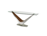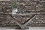 • Reverse hourglass-shaped, ½” thick tempered glass top is anchored and bonded by two stainless steel billets