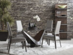 The strong geometry of Victor’s boldly tapered chevron-shaped body, clad in striking panels of brushed stainless steel and rich walnut veneer, all converge to create a modern sophisticated dining environment. A generous reverse hourglass-shaped glass top further reinforces Victor’s refined geometrical presence. Two solid stainless steel billets securely anchor the 1/2” thick tempered glass top. The entire body appears to hover above an understated steel base, which is available in all Elite’s powder-coat finishes. Victor will easily coordinate with and complement any of our popular dining chairs. Companion cocktail table, end table, and console are also available.